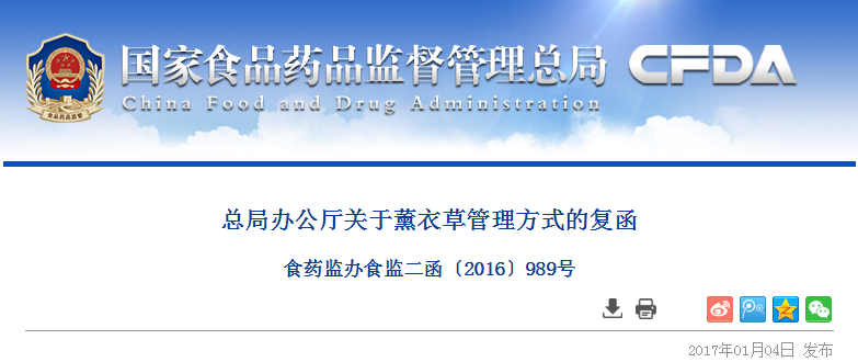 你局《關(guān)于明確薰衣草管理方式的請(qǐng)示》(冀食藥監(jiān)〔2016〕51號(hào))收悉。經(jīng)商農(nóng)業(yè)部和衛(wèi)生計(jì)生委,現(xiàn)函復(fù)如下: