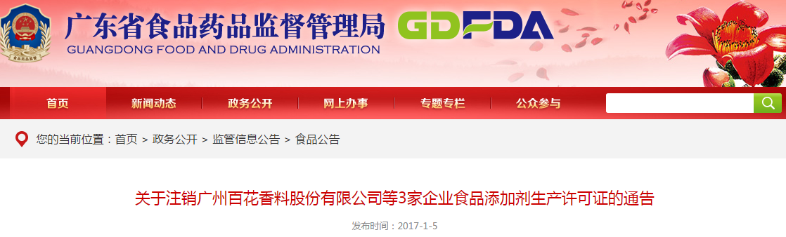 根據(jù)《中華人民共和國行政許可法》和《食品生產(chǎn)許可管理辦法》(國家食品藥品監(jiān)督管理總局令第16號)的有關規(guī)定,我局決定注銷廣州百花香料股份有限公司等3家企業(yè)的3張食品添加劑生產(chǎn)許可證(名單見附件)。
