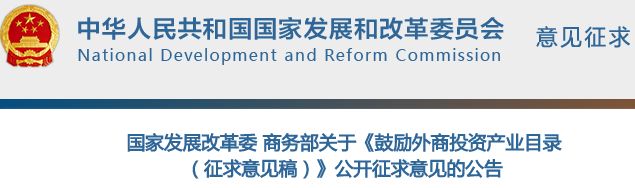2月1日,為貫徹落實(shí)《國務(wù)院辦公廳關(guān)于聚焦企業(yè)關(guān)切進(jìn)一步推動(dòng)優(yōu)化營商環(huán)境政策落實(shí)的通知》(國辦發(fā)〔2018〕104號(hào)),國家發(fā)展改革委和商務(wù)部聯(lián)合發(fā)布了關(guān)于《鼓勵(lì)外商投資產(chǎn)業(yè)目錄(征求意見稿)》。