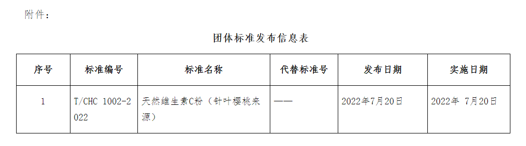 根據(jù)《中國保健協(xié)會(huì)團(tuán)體標(biāo)準(zhǔn)管理辦法(試行)》相關(guān)規(guī)定,《天然維生素C粉(針葉櫻桃來源)》團(tuán)體標(biāo)準(zhǔn)經(jīng)立項(xiàng)、起草、征求意見、審查等標(biāo)準(zhǔn)制訂程序,并通過中國保健協(xié)會(huì)批準(zhǔn),現(xiàn)予以發(fā)布。