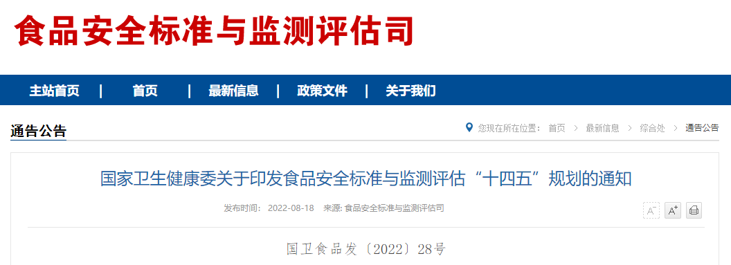 為貫徹《中華人民共和國食品安全法》,落實推進健康中國建設(shè)和實施食品安全戰(zhàn)略整體要求,我委組織制定了《食品安全標準與監(jiān)測評估“十四五”規(guī)劃》。現(xiàn)印發(fā)給你們,請認真貫徹執(zhí)行。