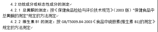 對(duì)于未制定國(guó)家標(biāo)準(zhǔn)、行業(yè)標(biāo)準(zhǔn)的功效成分或標(biāo)志性成分的檢測(cè)方法,須列出其詳細(xì)內(nèi)容;對(duì)于未制定國(guó)家標(biāo)準(zhǔn)、行業(yè)標(biāo)準(zhǔn)的原、輔料,其質(zhì)量標(biāo)準(zhǔn)中應(yīng)包括反映原、輔料特征的指標(biāo)(如主要成分及含量、色澤、性狀、滋味、氣味等)、理化指標(biāo)(如水分、灰分、粒度等)及污染物指標(biāo)(如鉛、砷、汞、六六六、滴滴涕、微生物指標(biāo)等),并列表表示。