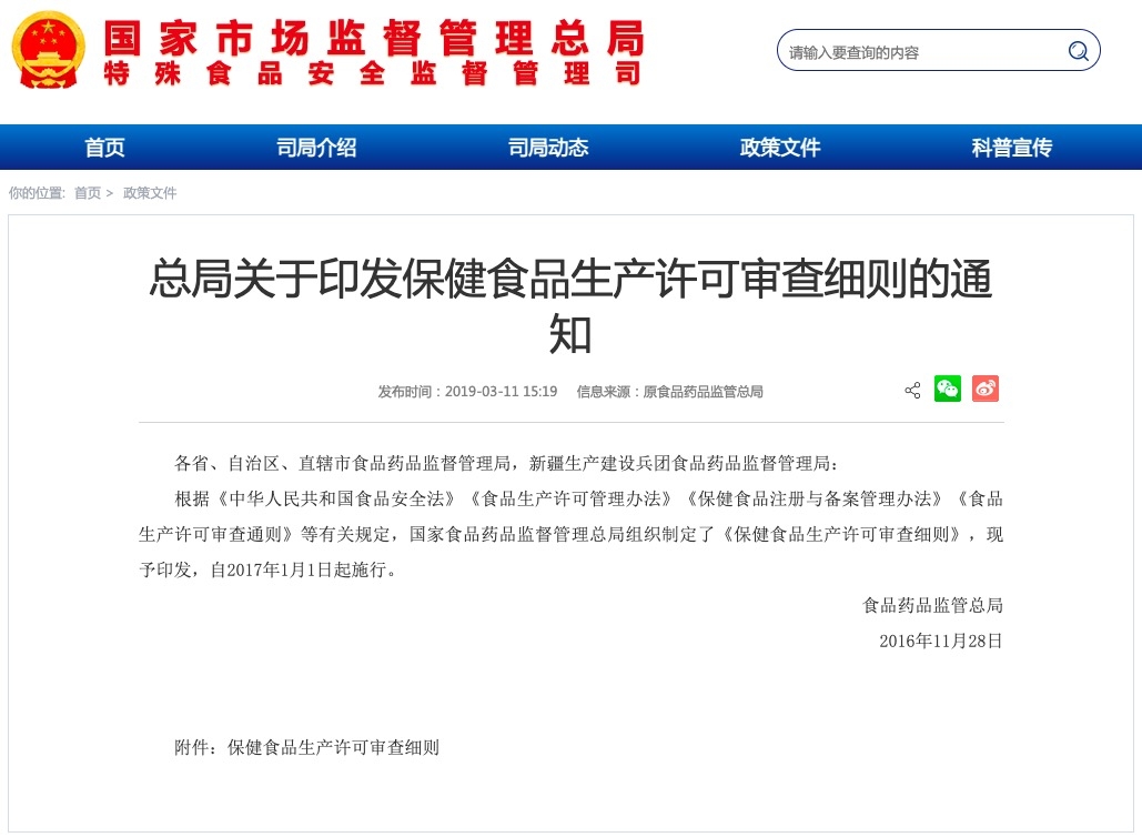 為規(guī)范保健食品生產許可審查工作,督促企業(yè)落實主體責任,保障保健食品質量安全,依據《中華人民共和國食品安全法》《食品生產許可管理辦法》《保健食品注冊與備案管理辦法》《保健食品良好生產規(guī)范》《食品生產許可審查通則》等相關法律法規(guī)和技術標準的規(guī)定,制定本細則。