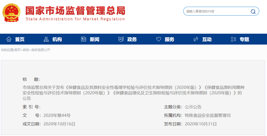 根據(jù)《中華人民共和國食品安全法》,經(jīng)與國家衛(wèi)生健康委協(xié)商一致,市場監(jiān)管總局制定了《保健食品及其原料安全性毒理學(xué)檢驗與評價技術(shù)指導(dǎo)原則(2020年版)》《保健食品原料用菌種安全性檢驗與評價技術(shù)指導(dǎo)原則(2020年版)》《保健食品理化及衛(wèi)生指標(biāo)檢驗與評價技術(shù)指導(dǎo)原則(2020年版)》,現(xiàn)予印發(fā),自公告之日起施行。