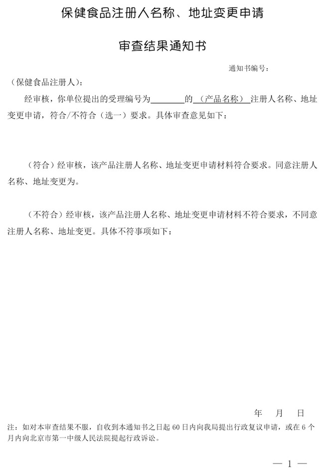 二、變更前持有證書為依據(jù)原注冊規(guī)章批準(zhǔn)的,發(fā)放《保健食品注冊人名稱、地址變更申請審查結(jié)果通知書》(見附件),與原批準(zhǔn)證明文件合并使用。