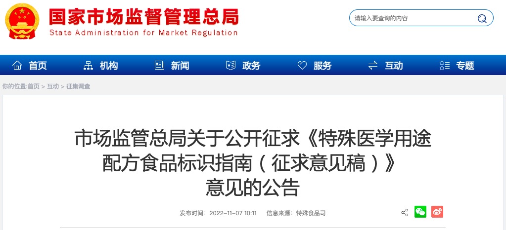 為指導(dǎo)特殊醫(yī)學(xué)用途配方食品(以下簡稱特醫(yī)食品)規(guī)范標(biāo)識,引導(dǎo)科學(xué)合理使用特醫(yī)食品,根據(jù)有關(guān)法律法規(guī),市場監(jiān)管總局組織制定了《特殊醫(yī)學(xué)用途配方食品標(biāo)識指南(征求意見稿)》,現(xiàn)面向社會公開征求意見,意見建議反饋截止時間為2022年11月25日。公眾可以通過以下途徑和方式提出意見建議:
