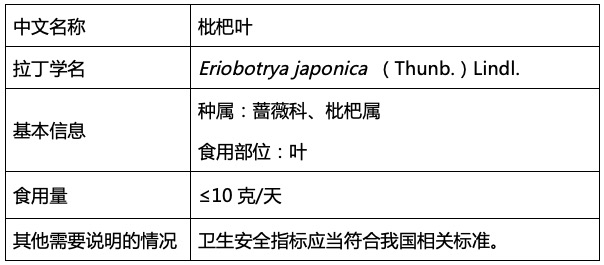 2014年12月19日,國(guó)家衛(wèi)生和計(jì)劃生育委員會(huì)發(fā)布《關(guān)于批準(zhǔn)番茄籽油等9種新食品原料的公告(2014年第20號(hào))》正式批準(zhǔn)枇杷葉為新食品原料,并對(duì)其食用部分、食用量等作出以下規(guī)定: