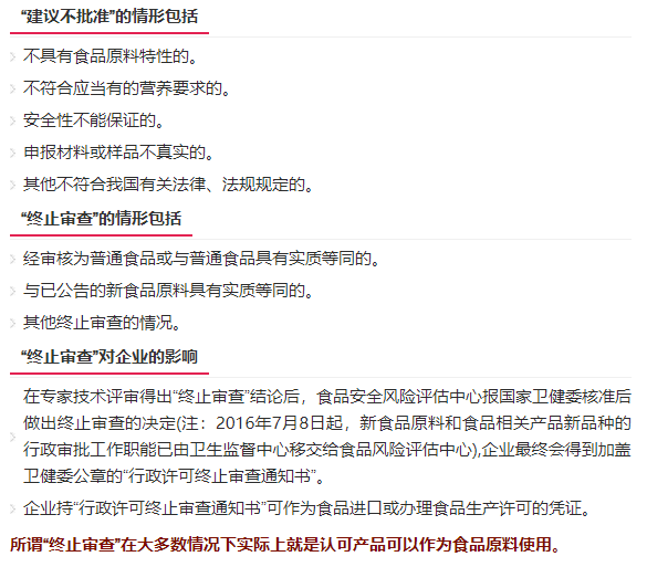 依據(jù)《新食品原料安全性審查規(guī)程》,新食品原料審查和批準(zhǔn)共涉4類情形:“延期再審”、“建議不批準(zhǔn)”、“終止審查”和“建議批準(zhǔn)”。